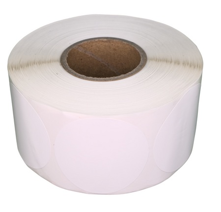 Białe etykiety FOLIOWE termotransferowe na rolce średnica 50mm 1000 sztuk, perforowane, do druku przez kalkę