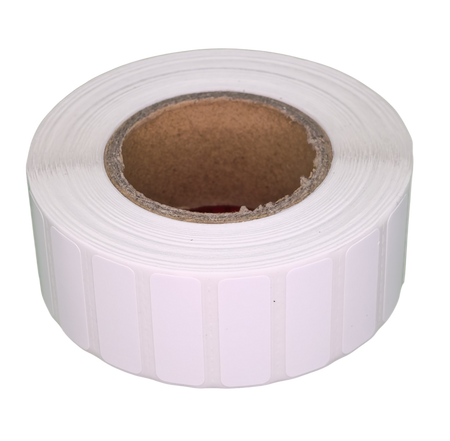 Białe etykiety termotransferowe na rolce 28x10mm 2000 sztuk, perforowane, do druku przez kalkę