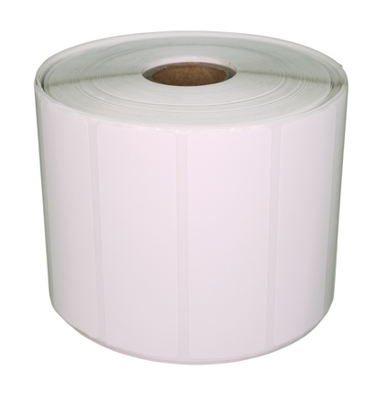 Białe etykiety termotransferowe na rolce 76x25mm 2580 sztuk, perforowane, do druku przez kalkę