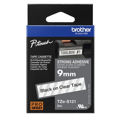 MODEL: TZe-S121 przeźroczysta taśma, czarny napis mocny klej