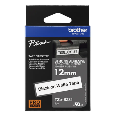 Taśma Brother Tze-S231 12mm 8m biała taśma czarny napis mocny klej strong oryginalna
