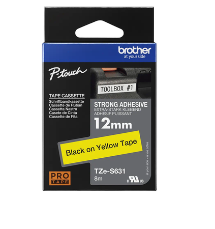 Taśma Brother TZe-S631 12mm 8m żółta taśma czarny napis mocny klej strong oryginalna