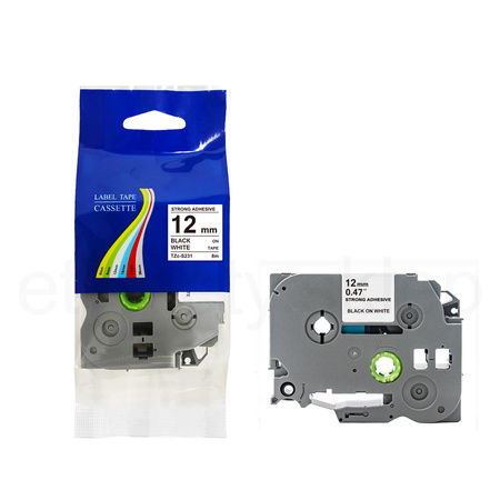 Taśma do Brother Tze-S231 12mm 8m biała taśma czarny napis mocny klej strong
